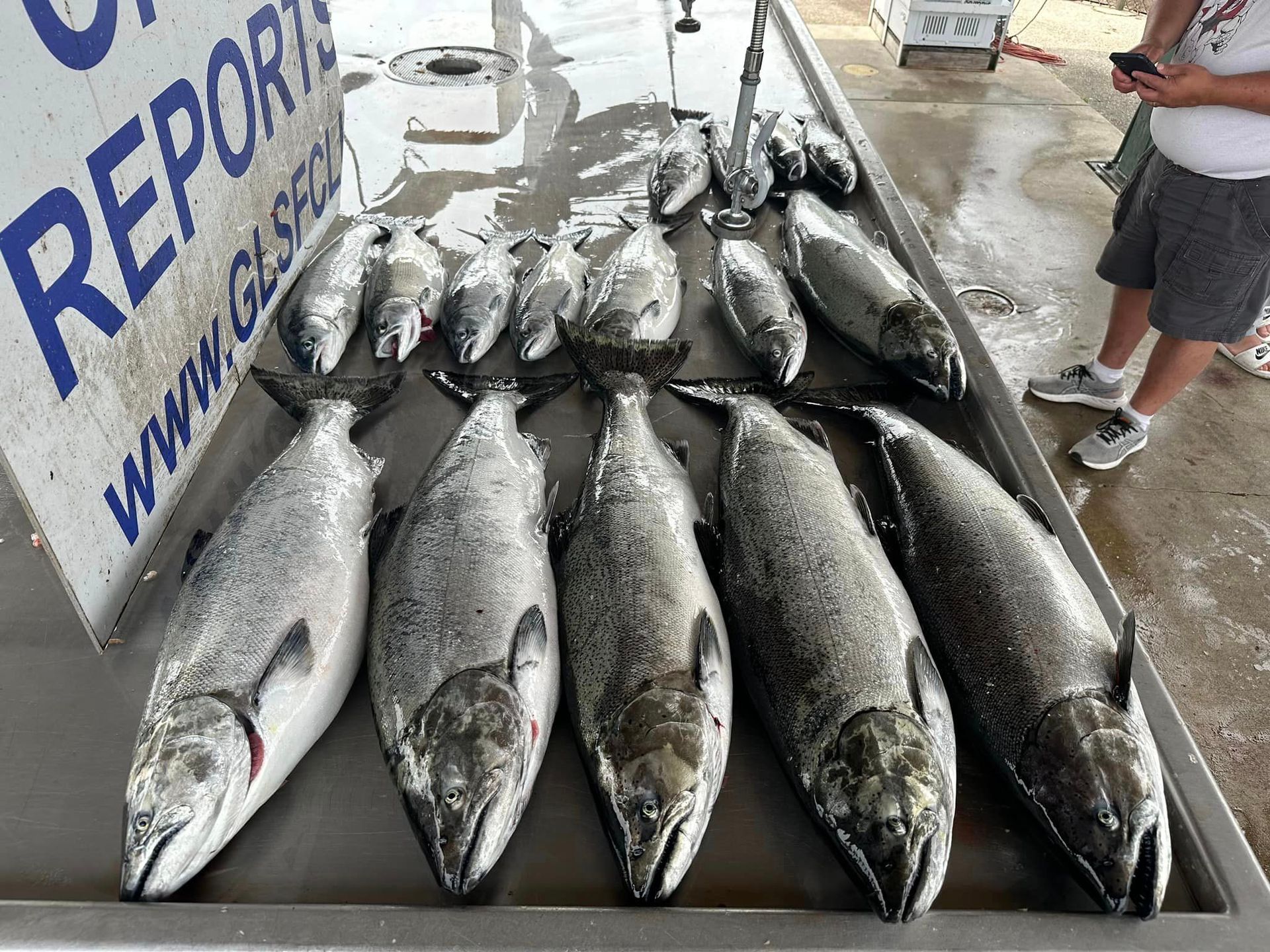 We provide fully guided trophy salmon and trout fishing on Lake Michigan out of Milwaukee, WI. We typically begin Coho salmon fishing sometime in May. This fishing can be fast and furious, often resulting in limits of salmon. As summer rolls around and the water temperatures warm up, we transition into fishing for more of a mixed bag including big King salmon.